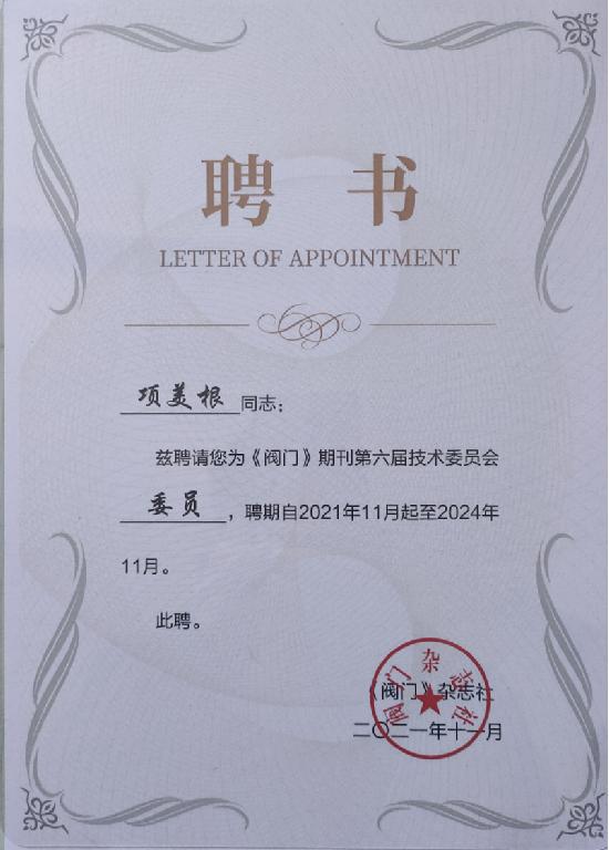 2021年11月26日,閥門期刊第六屆技術委員會換屆會議暨第一次工作會議在上海嘉定希爾頓逸林酒店召開。項美根終身名譽董事長應邀出席,并被誠摯邀請項美根同志擔任本刊第六屆技術委員會委員。