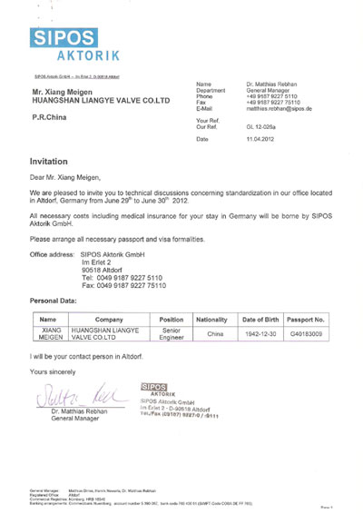 黃山良業閥門有限公司董事長項美根應邀出席德國柏林召開的國際閥門標準化會議,目前已收到din標準化組織發來的邀請函(valves standards committee)。黃山良業閥門有限公司是國內著名的閥門電動裝置生產企業,由我國第二代閥門電動裝置聯合設計主持人項美根同志擔任董事長。由他主持開發研制hz型、hq型、qc型閥門電動裝置及以上各型的整體式;綜合采用了國內外先進技術,具有功能全、體積小、重量輕、標準化、通用化、系列化程度高等特點,是目前我國自行研制的能派生普通型、戶外型、隔爆型、戶外隔爆型多回轉式和部分回轉式閥門電動裝置中品種規格最多的產品。另有閥門啟閉扭矩連續測試裝置、立美克智能型電動執行機構等多項產品獲得知識產權專利。(文/johnny)