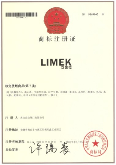 黃山良業閥門旗下“LIMEK”立美克獲國家商標局頒發注冊證